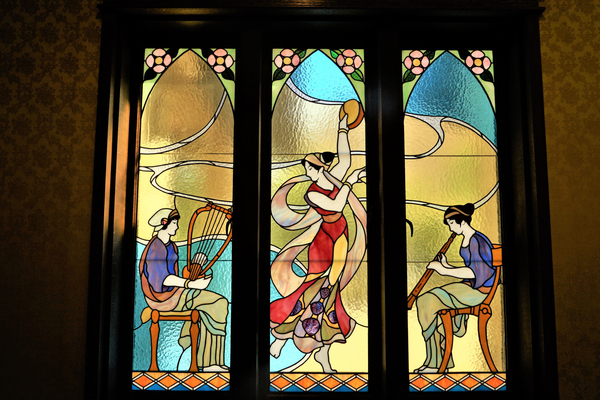 大広間の西側の窓にあしらわれている「踊り子」。西日に照らされると、室内に色とりどりな光が差し込んでいた