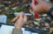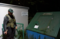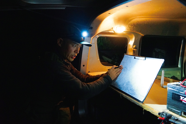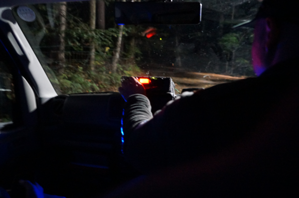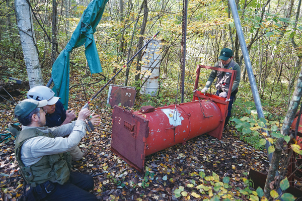 小さなのぞき穴からドラム缶わなの中を見ると、丸まったツキノワグマの肉球が確認できた