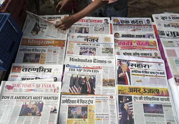 • 24年11月7日、トランプ氏の当選を報じるインド紙(AP/AFLO)
