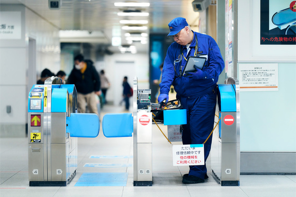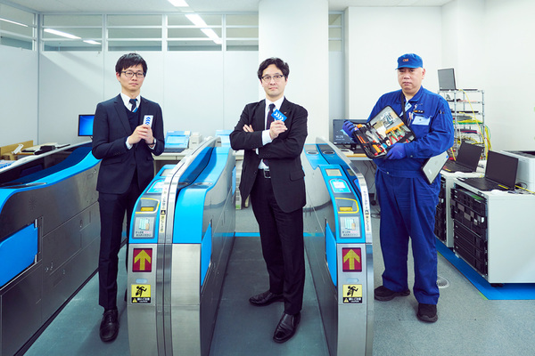 写真左から玉井祐行さん、竹内雅幸さん、戸田雅之さん。数秒で新幹線の自動改札機を通過できるという便利さの裏には、技術の進歩とともに彼らのたゆまぬ努力と誇りがあるのだ
