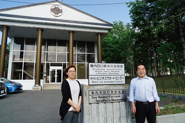 市民、民間企業などの篤志で建てられた稚内市日ロ友好会館を前に、稚内日ロ経済交流協会の石田典子さん(左)と伊藤裕さん