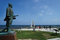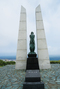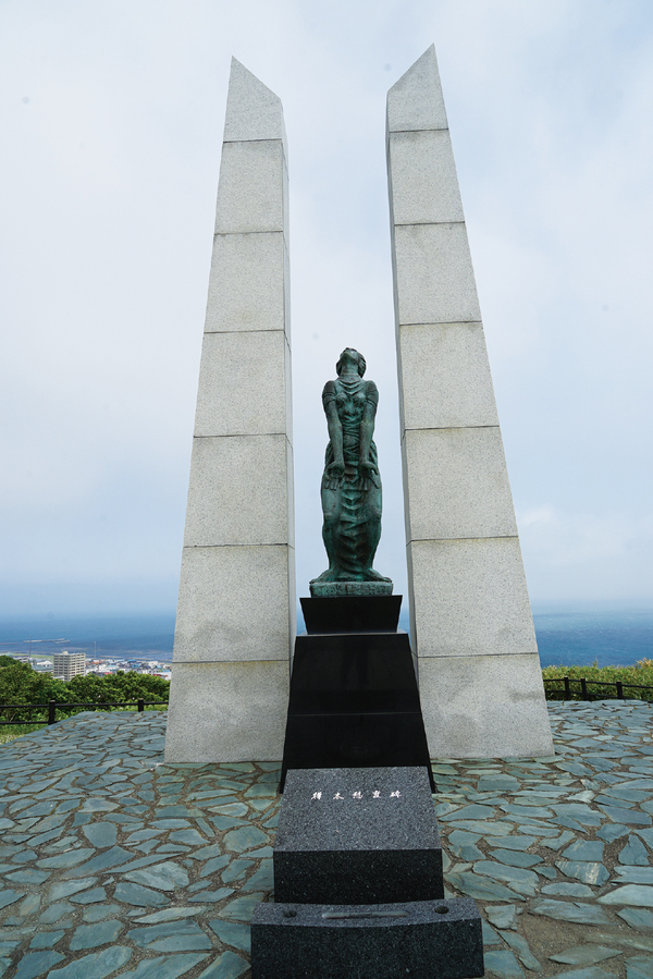 樺太で亡くなった人たちの慰霊のために建てられた「氷雪の門」。天気が良い日には像の背後にサハリンが見える