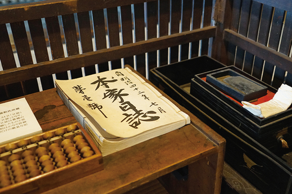 入り口を入ってすぐの店の間に置かれた本家日誌。本家で勤務する店員が日常や来客情報を記帳していた