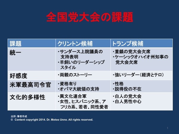 好感度と統一、クリントン・トランプ、党大会の課題