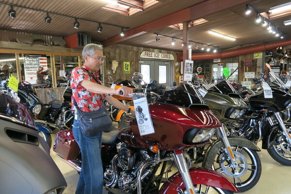 ずらりと並ぶハーレーの新型モデル。オジサンもハーレー様をいじくってみる