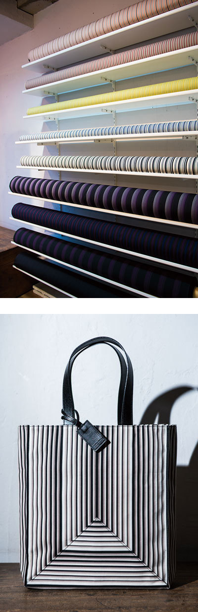 • 「小倉 縞縞」のテキスタイル(上)とバッグ(下)。機械織りで広幅にすることで用途が広がった