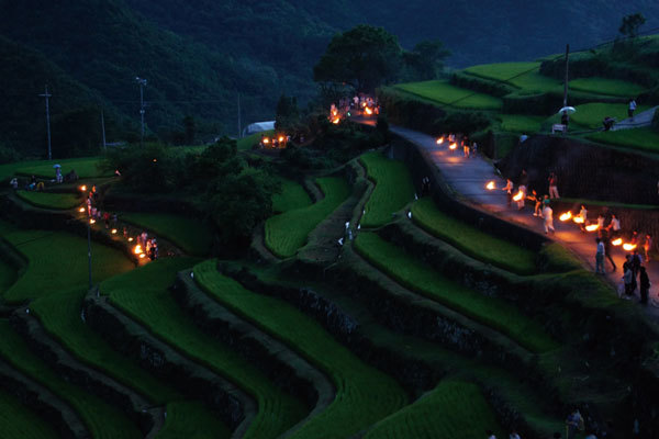 一面の棚田にゆらめく光の行列