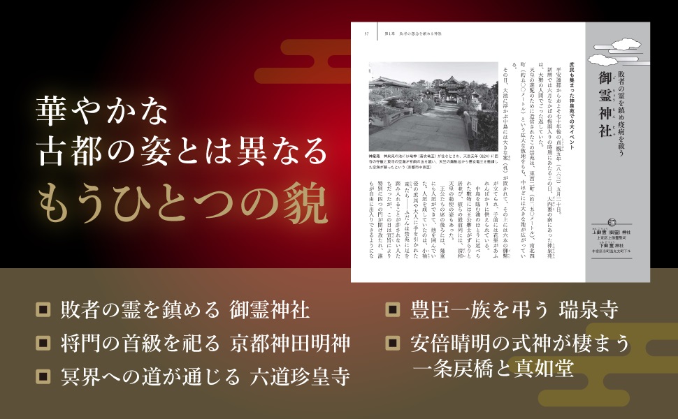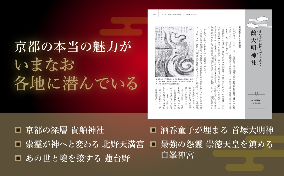 1200年もの歴史を有する京都には「裏の貌」と呼べるべき痕跡が至る所にあり、神社や古寺は時代を超え、「現世」と「異界」のつながりを感じやすい場でもある。「怨霊と御霊」「殺戮と鎮魂」「葬地と聖地」…テレビ番組でも話題を呼び、広がりつつある京都異界ブーム。オモテとウラの両面から知る「もうひとつの京都」。