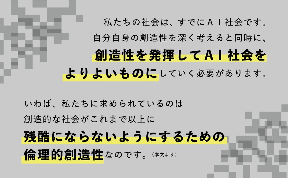 私たちの社会は、すでにAI社会です。自分自身の創造性を深く考えると同時に、創造性を発揮してAI社会をよりよいものにしていく必要があります。いわば、私たちに求められているのは創造的な社会がこれまで以上に残酷にならないようにするための倫理的創造性なのです。(「序章」より)